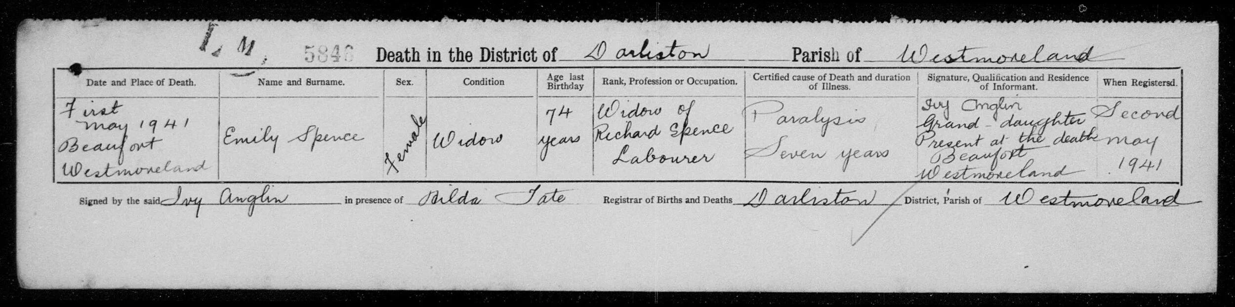 Mother: CAROLINE SPENCE. DOB btw 1896-1900. Westmoreland.